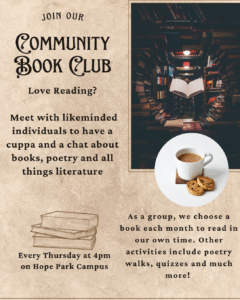We will create our own reading list from the available library books at Hope University. The group will read the same book each month and then we will discuss it.